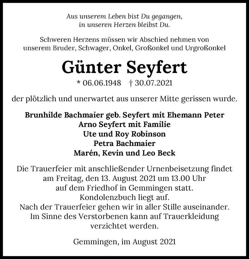 Hier finden Sie alle Traueranzeigen aus der Zeitung, die bisher für Günter Seyfert erschienen sind. Weitere Traueranzeigen, die in der Zeitung erscheinen, werden hier ebenfalls aufgelistet