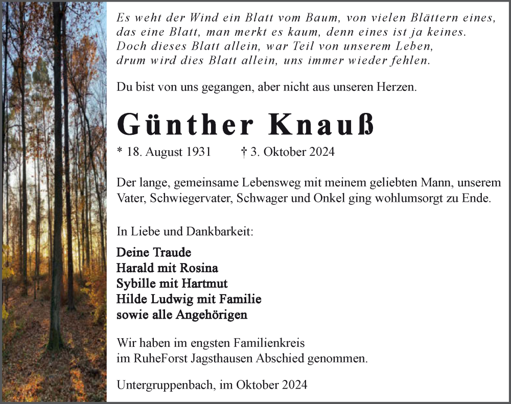 Hier finden Sie alle Traueranzeigen aus der Zeitung, die bisher für Günther Knauß erschienen sind. Weitere Traueranzeigen, die in der Zeitung erscheinen, werden hier ebenfalls aufgelistet