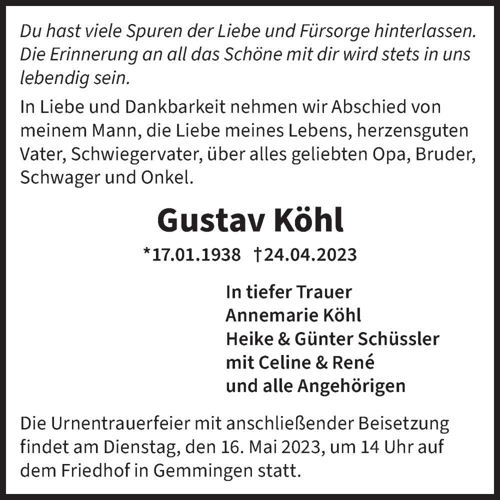Hier finden Sie alle Traueranzeigen aus der Zeitung, die bisher für Gustav Köhl erschienen sind. Weitere Traueranzeigen, die in der Zeitung erscheinen, werden hier ebenfalls aufgelistet