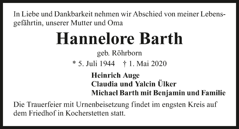 Hier finden Sie alle Traueranzeigen aus der Zeitung, die bisher für Hannelore Barth erschienen sind. Weitere Traueranzeigen, die in der Zeitung erscheinen, werden hier ebenfalls aufgelistet