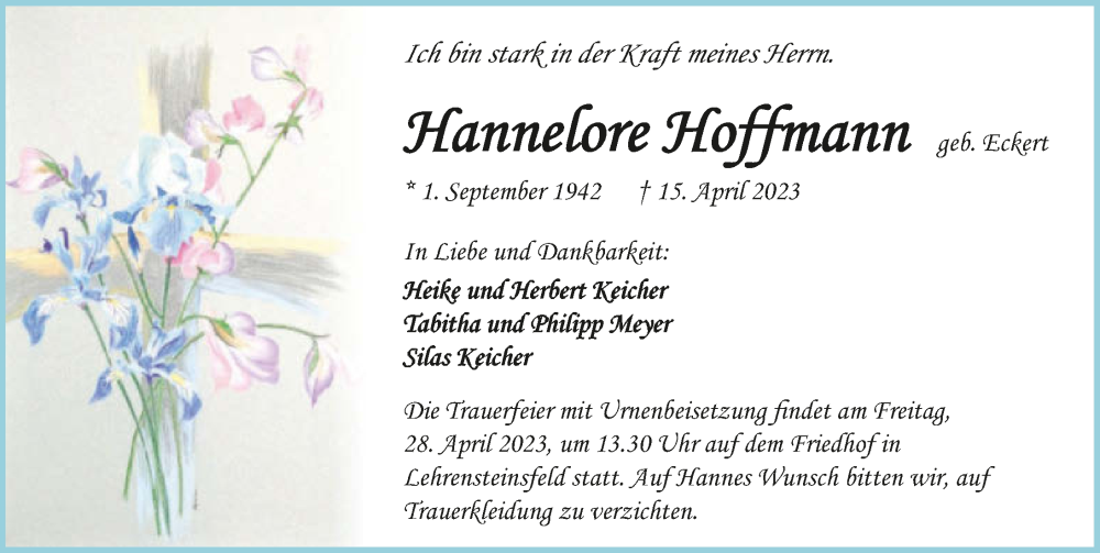 Hier finden Sie alle Traueranzeigen aus der Zeitung, die bisher für Hannelore Hoffmann erschienen sind. Weitere Traueranzeigen, die in der Zeitung erscheinen, werden hier ebenfalls aufgelistet