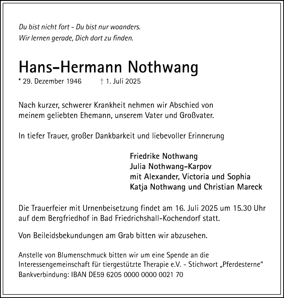 Hier finden Sie alle Traueranzeigen aus der Zeitung, die bisher für Hans-Hermann Nothwang erschienen sind. Weitere Traueranzeigen, die in der Zeitung erscheinen, werden hier ebenfalls aufgelistet