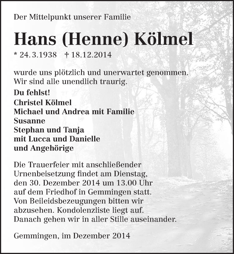 Hier finden Sie alle Traueranzeigen aus der Zeitung, die bisher für Hans Kölmel erschienen sind. Weitere Traueranzeigen, die in der Zeitung erscheinen, werden hier ebenfalls aufgelistet