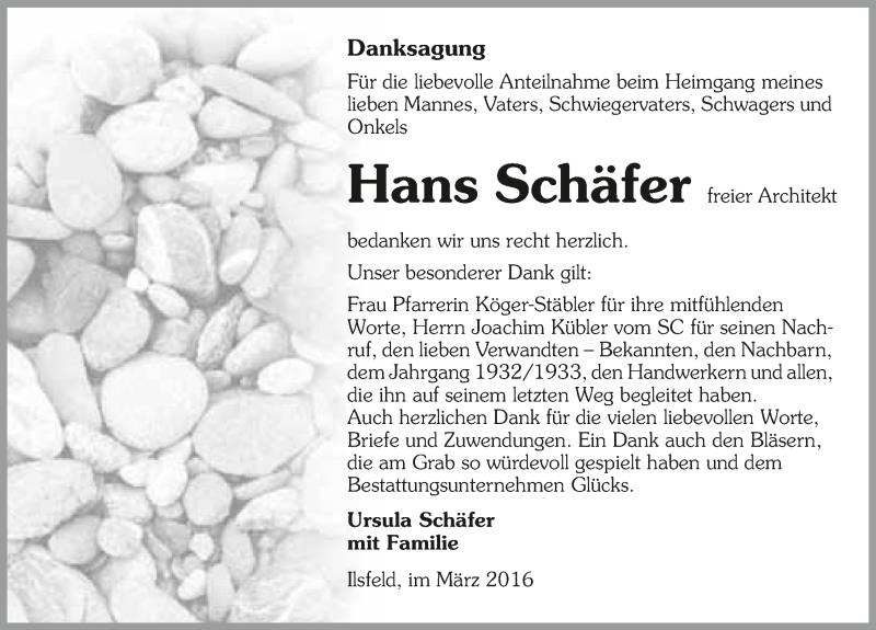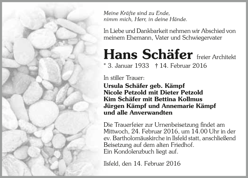 Hier finden Sie alle Traueranzeigen aus der Zeitung, die bisher für Hans Schäfer erschienen sind. Weitere Traueranzeigen, die in der Zeitung erscheinen, werden hier ebenfalls aufgelistet
