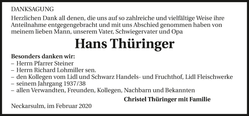 Hier finden Sie alle Traueranzeigen aus der Zeitung, die bisher für Hans Thüringer erschienen sind. Weitere Traueranzeigen, die in der Zeitung erscheinen, werden hier ebenfalls aufgelistet