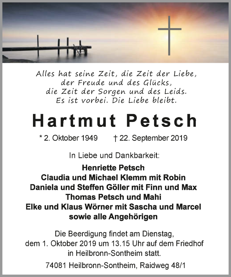 Hier finden Sie alle Traueranzeigen aus der Zeitung, die bisher für Hartmut Petsch erschienen sind. Weitere Traueranzeigen, die in der Zeitung erscheinen, werden hier ebenfalls aufgelistet
