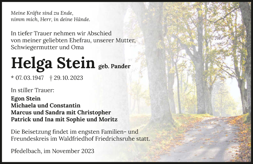 Hier finden Sie alle Traueranzeigen aus der Zeitung, die bisher für Helga Stein erschienen sind. Weitere Traueranzeigen, die in der Zeitung erscheinen, werden hier ebenfalls aufgelistet