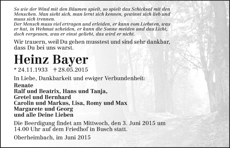 Hier finden Sie alle Traueranzeigen aus der Zeitung, die bisher für Heinz Bayer erschienen sind. Weitere Traueranzeigen, die in der Zeitung erscheinen, werden hier ebenfalls aufgelistet