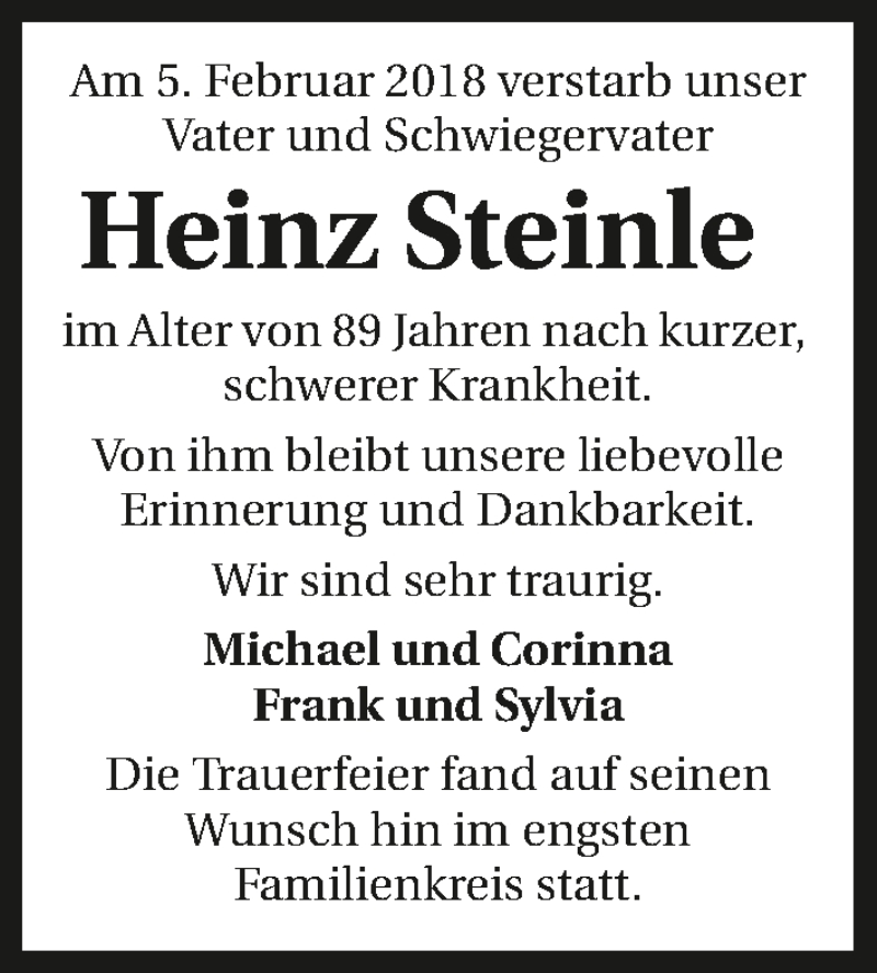 Hier finden Sie alle Traueranzeigen aus der Zeitung, die bisher für Heinz Steinle erschienen sind. Weitere Traueranzeigen, die in der Zeitung erscheinen, werden hier ebenfalls aufgelistet