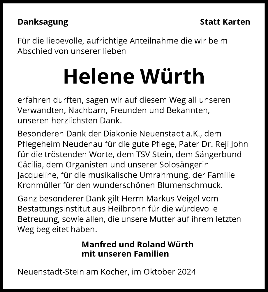Hier finden Sie alle Traueranzeigen aus der Zeitung, die bisher für Helene Würth erschienen sind. Weitere Traueranzeigen, die in der Zeitung erscheinen, werden hier ebenfalls aufgelistet
