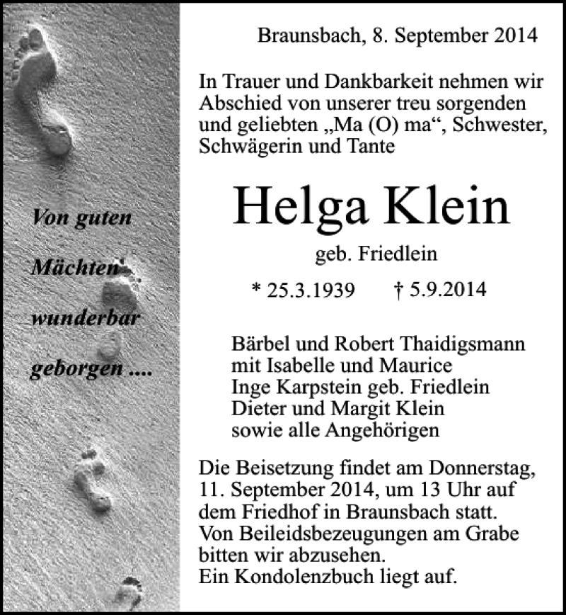 Hier finden Sie alle Traueranzeigen aus der Zeitung, die bisher für Helga Klein erschienen sind. Weitere Traueranzeigen, die in der Zeitung erscheinen, werden hier ebenfalls aufgelistet