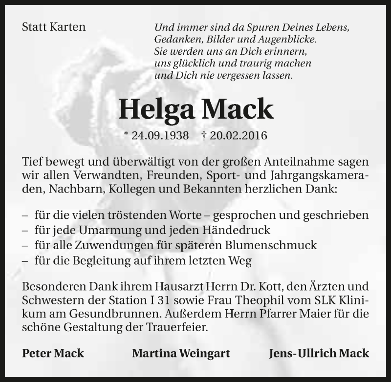 Hier finden Sie alle Traueranzeigen aus der Zeitung, die bisher für Helga Mack erschienen sind. Weitere Traueranzeigen, die in der Zeitung erscheinen, werden hier ebenfalls aufgelistet