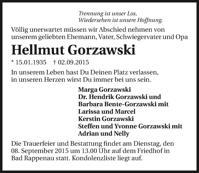 Hier finden Sie alle Traueranzeigen aus der Zeitung, die bisher für Hellmut Gorzawski erschienen sind. Weitere Traueranzeigen, die in der Zeitung erscheinen, werden hier ebenfalls aufgelistet