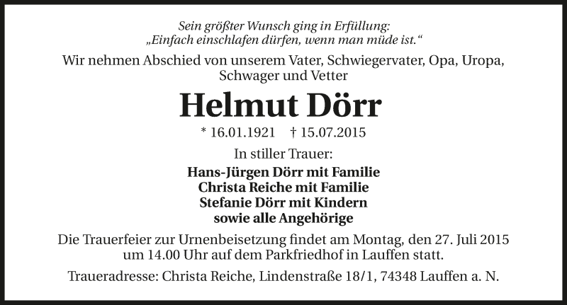 Hier finden Sie alle Traueranzeigen aus der Zeitung, die bisher für Helmut Dörr erschienen sind. Weitere Traueranzeigen, die in der Zeitung erscheinen, werden hier ebenfalls aufgelistet