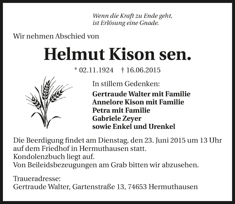 Hier finden Sie alle Traueranzeigen aus der Zeitung, die bisher für Helmut Kison erschienen sind. Weitere Traueranzeigen, die in der Zeitung erscheinen, werden hier ebenfalls aufgelistet