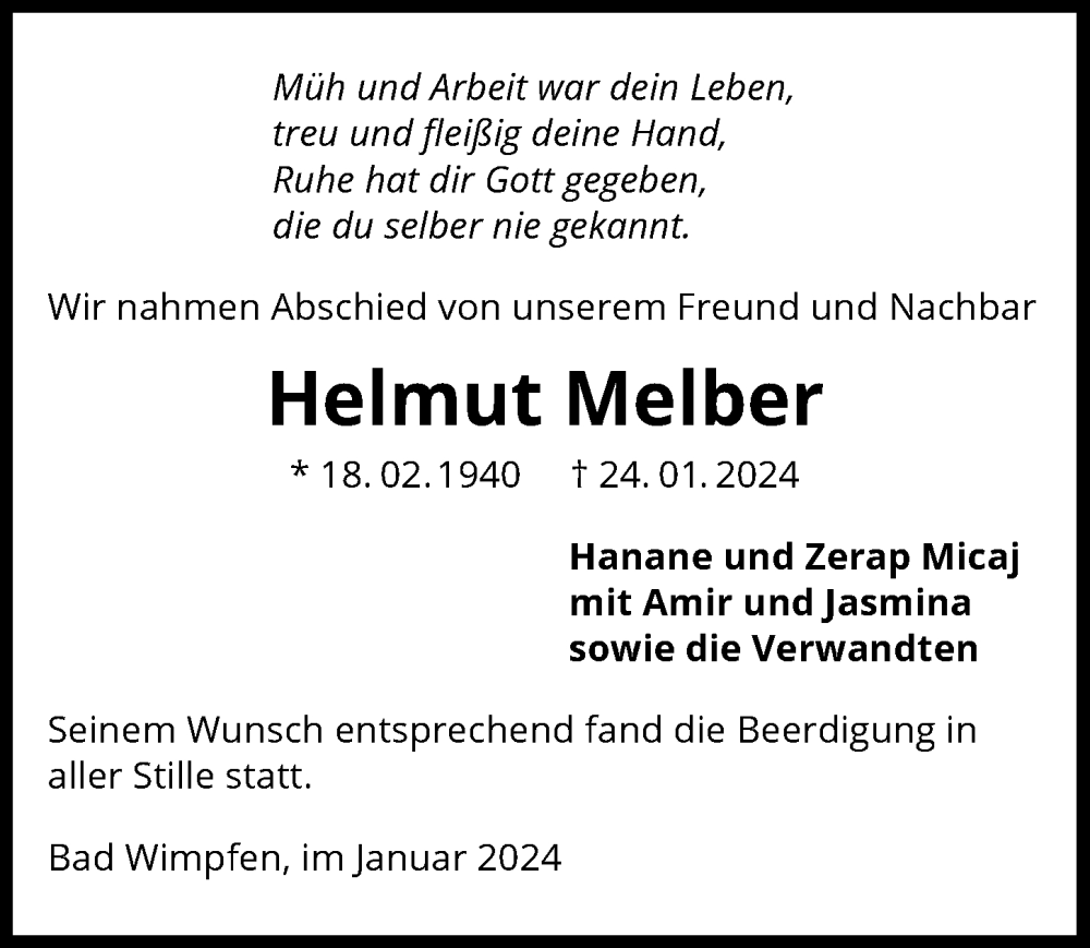 Hier finden Sie alle Traueranzeigen aus der Zeitung, die bisher für Helmut Melber erschienen sind. Weitere Traueranzeigen, die in der Zeitung erscheinen, werden hier ebenfalls aufgelistet