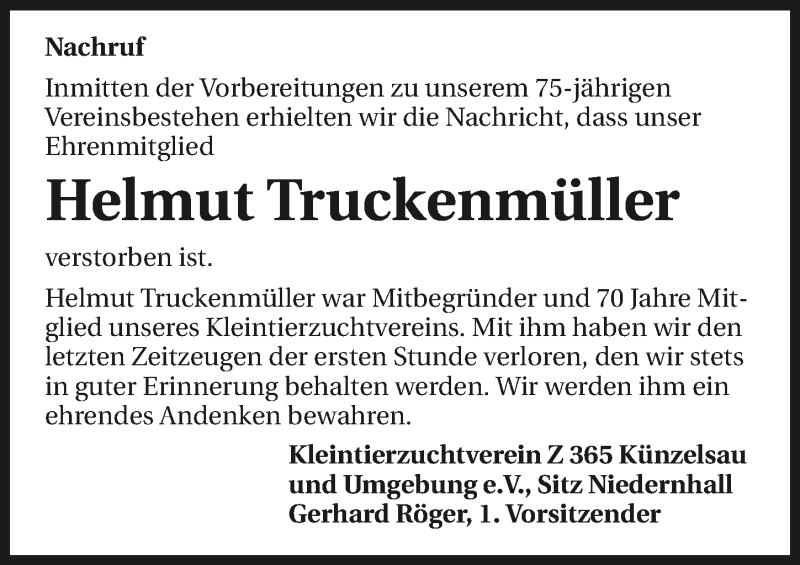 Hier finden Sie alle Traueranzeigen aus der Zeitung, die bisher für Helmut Truckenmüller erschienen sind. Weitere Traueranzeigen, die in der Zeitung erscheinen, werden hier ebenfalls aufgelistet