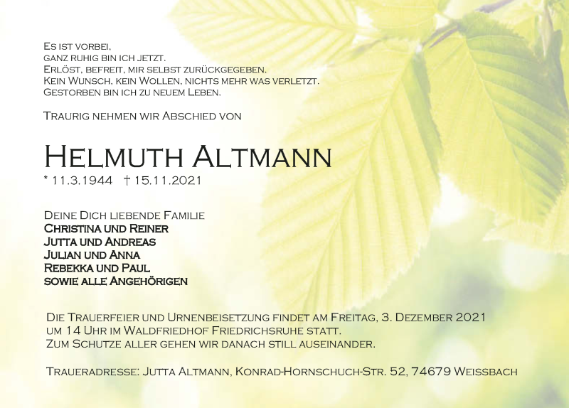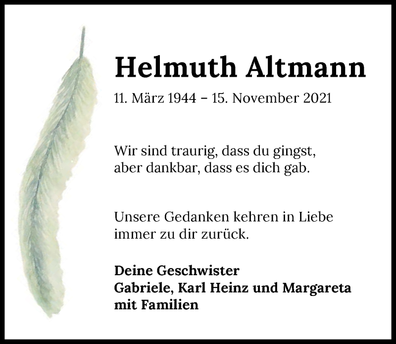 Hier finden Sie alle Traueranzeigen aus der Zeitung, die bisher für Helmuth Altmann erschienen sind. Weitere Traueranzeigen, die in der Zeitung erscheinen, werden hier ebenfalls aufgelistet