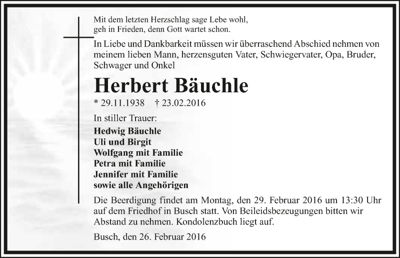 Hier finden Sie alle Traueranzeigen aus der Zeitung, die bisher für Herbert Bäuchle erschienen sind. Weitere Traueranzeigen, die in der Zeitung erscheinen, werden hier ebenfalls aufgelistet