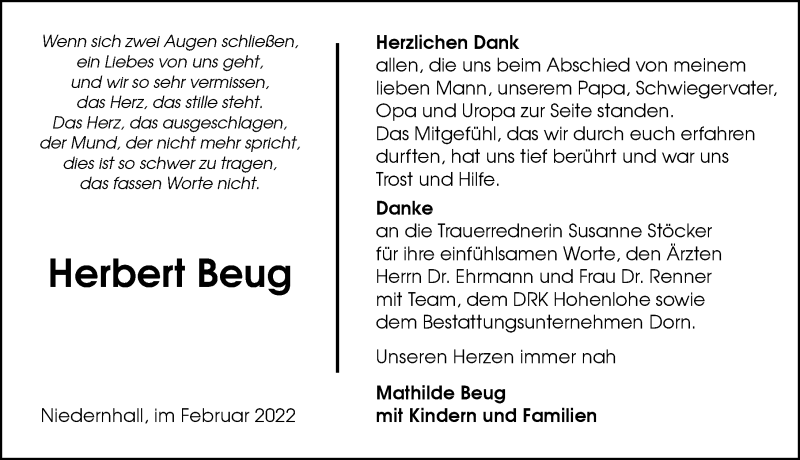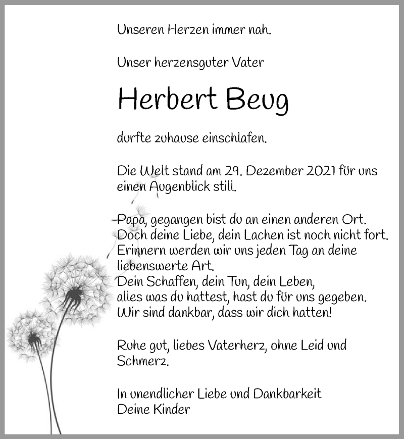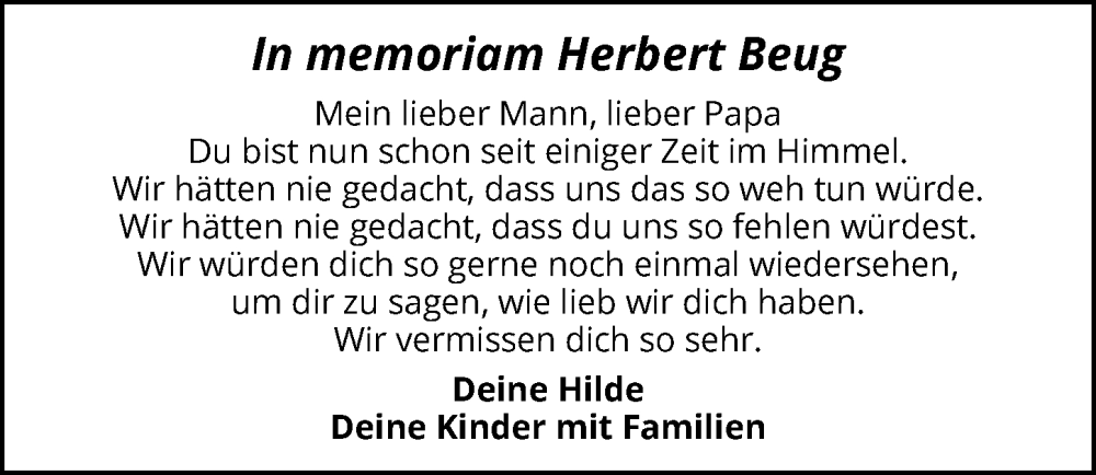 Hier finden Sie alle Traueranzeigen aus der Zeitung, die bisher für Herbert Beug erschienen sind. Weitere Traueranzeigen, die in der Zeitung erscheinen, werden hier ebenfalls aufgelistet