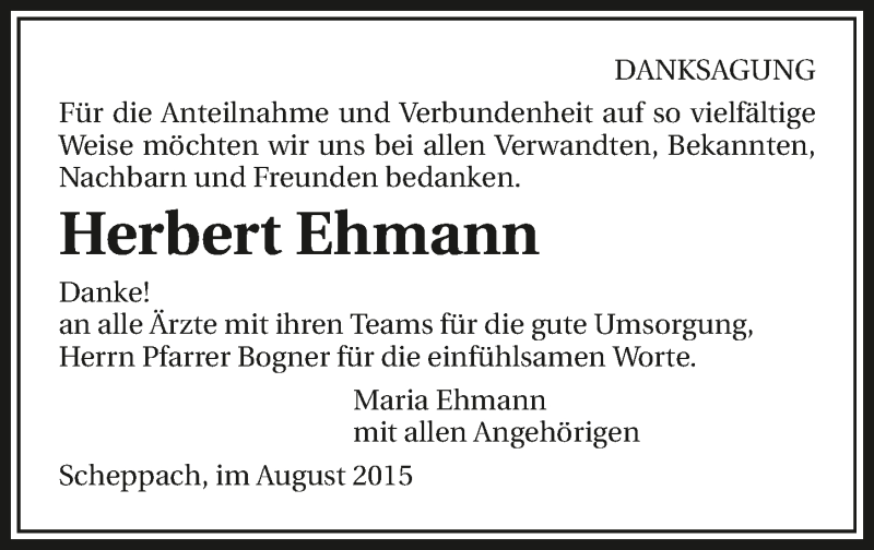 Hier finden Sie alle Traueranzeigen aus der Zeitung, die bisher für Herbert Ehmann erschienen sind. Weitere Traueranzeigen, die in der Zeitung erscheinen, werden hier ebenfalls aufgelistet