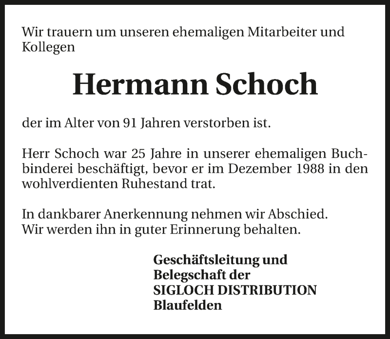 Hier finden Sie alle Traueranzeigen aus der Zeitung, die bisher für Hermann Schoch erschienen sind. Weitere Traueranzeigen, die in der Zeitung erscheinen, werden hier ebenfalls aufgelistet