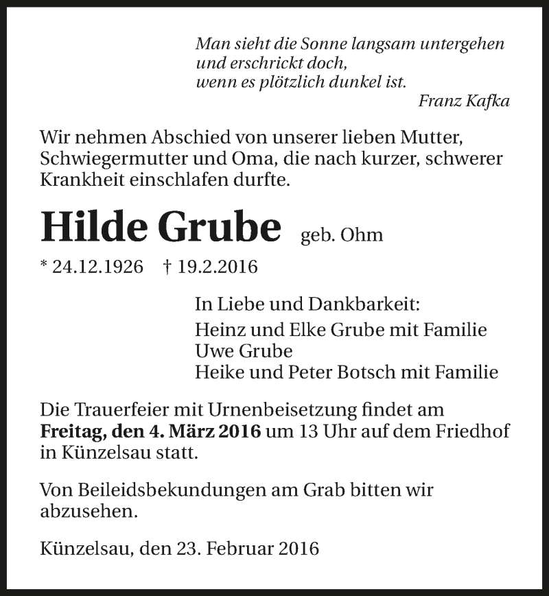 Hier finden Sie alle Traueranzeigen aus der Zeitung, die bisher für Hilde Grube erschienen sind. Weitere Traueranzeigen, die in der Zeitung erscheinen, werden hier ebenfalls aufgelistet