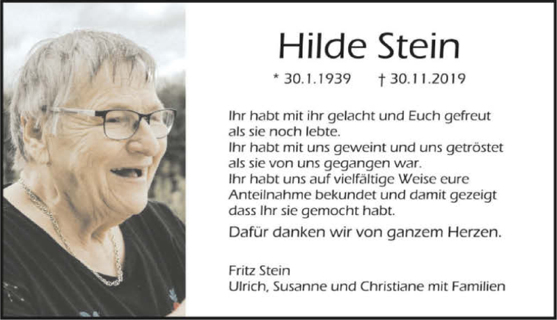 Hier finden Sie alle Traueranzeigen aus der Zeitung, die bisher für Hilde Stein erschienen sind. Weitere Traueranzeigen, die in der Zeitung erscheinen, werden hier ebenfalls aufgelistet