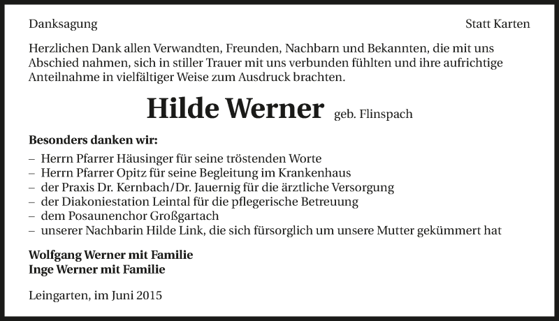 Hier finden Sie alle Traueranzeigen aus der Zeitung, die bisher für Hilde Werner erschienen sind. Weitere Traueranzeigen, die in der Zeitung erscheinen, werden hier ebenfalls aufgelistet