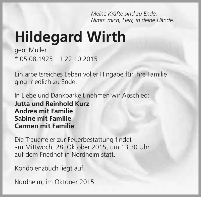 Hier finden Sie alle Traueranzeigen aus der Zeitung, die bisher für Hildegard Wirth erschienen sind. Weitere Traueranzeigen, die in der Zeitung erscheinen, werden hier ebenfalls aufgelistet