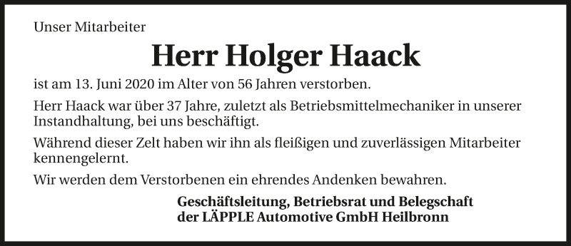 Hier finden Sie alle Traueranzeigen aus der Zeitung, die bisher für Holger Haack erschienen sind. Weitere Traueranzeigen, die in der Zeitung erscheinen, werden hier ebenfalls aufgelistet