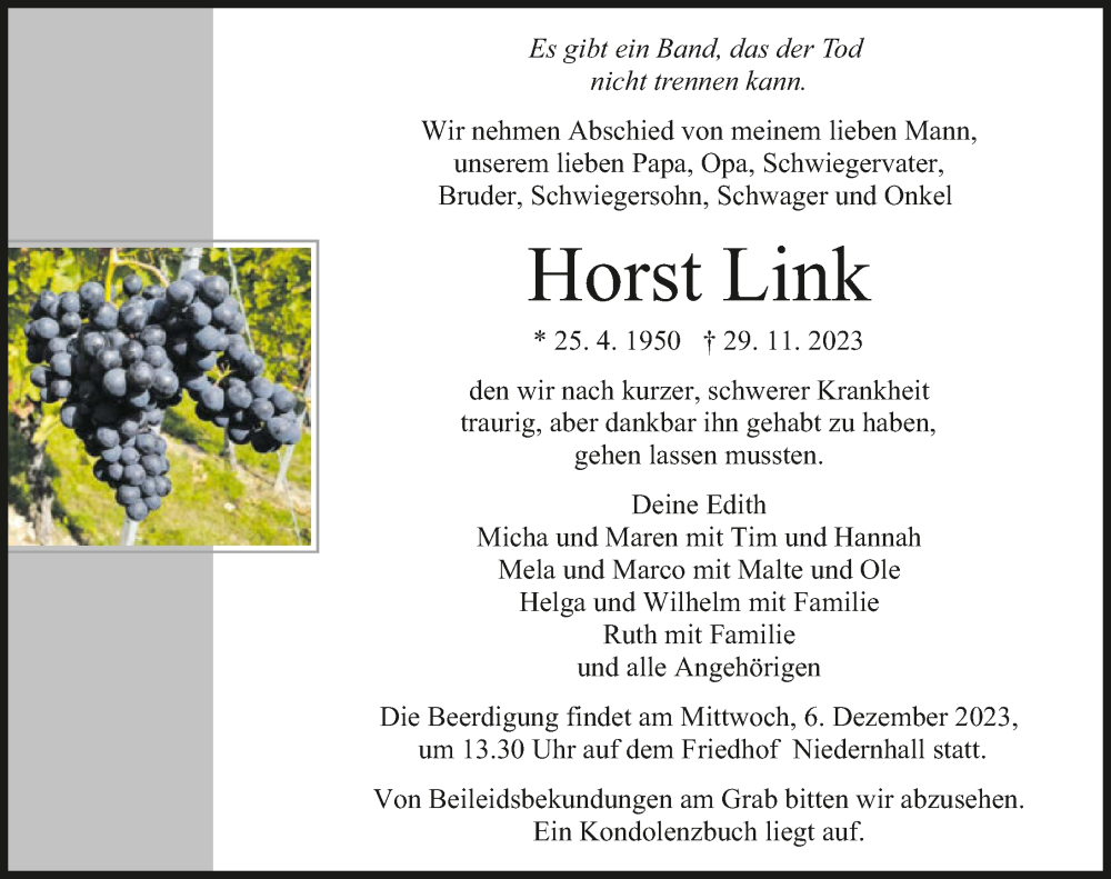 Hier finden Sie alle Traueranzeigen aus der Zeitung, die bisher für Horst Link erschienen sind. Weitere Traueranzeigen, die in der Zeitung erscheinen, werden hier ebenfalls aufgelistet