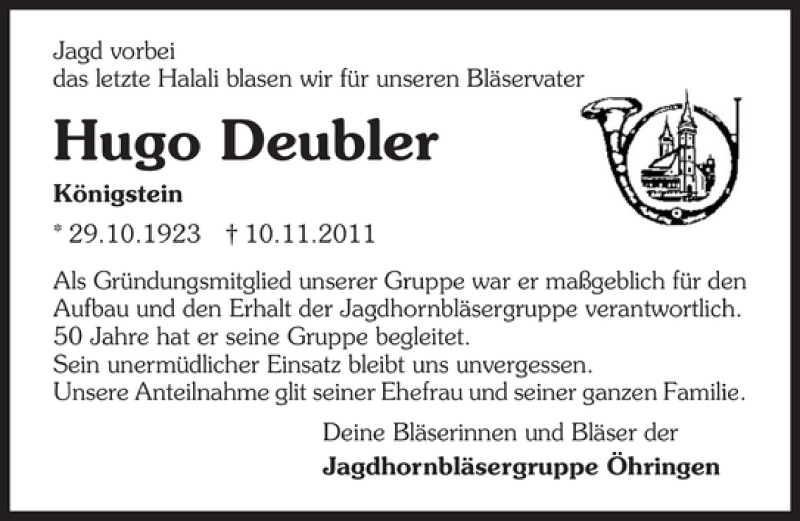Hier finden Sie alle Traueranzeigen aus der Zeitung, die bisher für Hugo/Bläsergruppe Deubler erschienen sind. Weitere Traueranzeigen, die in der Zeitung erscheinen, werden hier ebenfalls aufgelistet