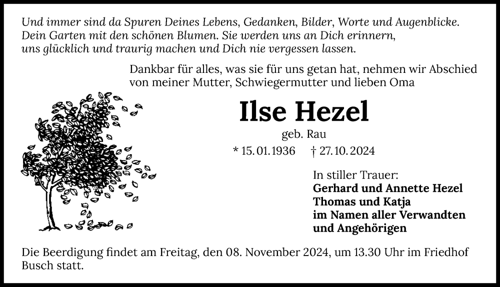 Hier finden Sie alle Traueranzeigen aus der Zeitung, die bisher für Ilse Hezel erschienen sind. Weitere Traueranzeigen, die in der Zeitung erscheinen, werden hier ebenfalls aufgelistet