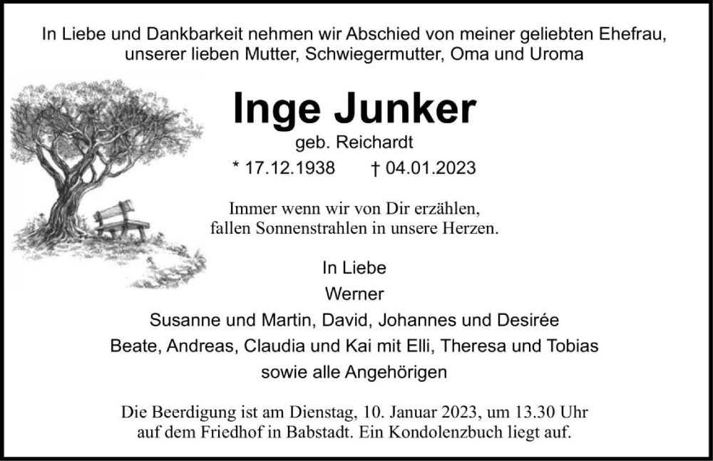 Hier finden Sie alle Traueranzeigen aus der Zeitung, die bisher für Inge Junker erschienen sind. Weitere Traueranzeigen, die in der Zeitung erscheinen, werden hier ebenfalls aufgelistet