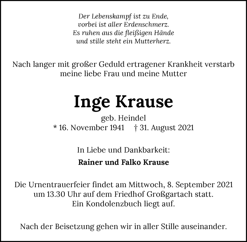 Hier finden Sie alle Traueranzeigen aus der Zeitung, die bisher für Inge Krause erschienen sind. Weitere Traueranzeigen, die in der Zeitung erscheinen, werden hier ebenfalls aufgelistet