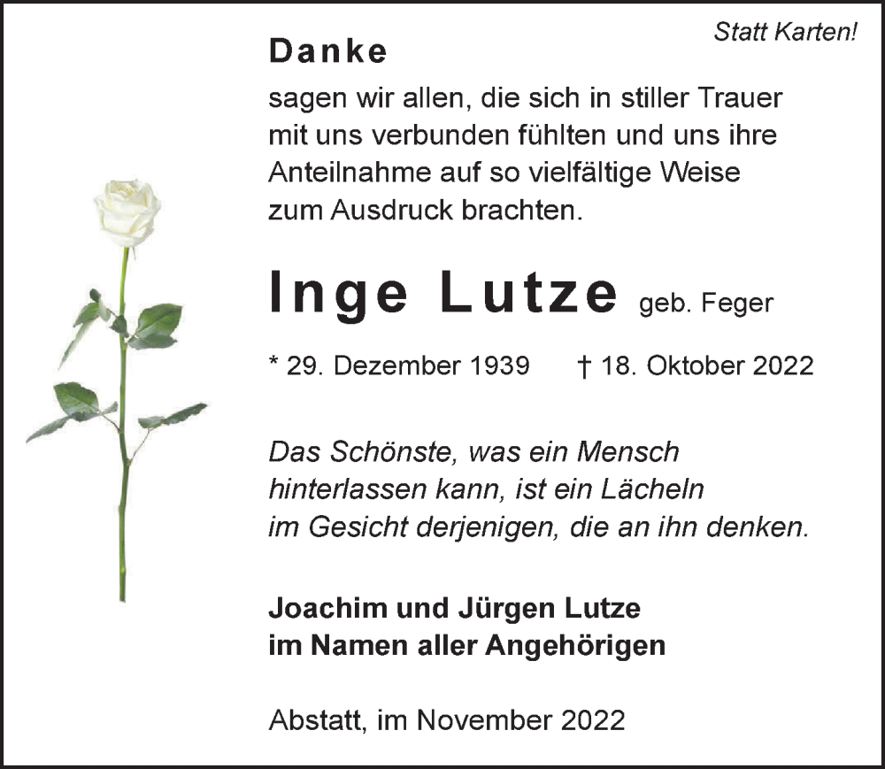 Hier finden Sie alle Traueranzeigen aus der Zeitung, die bisher für Inge Lutze erschienen sind. Weitere Traueranzeigen, die in der Zeitung erscheinen, werden hier ebenfalls aufgelistet