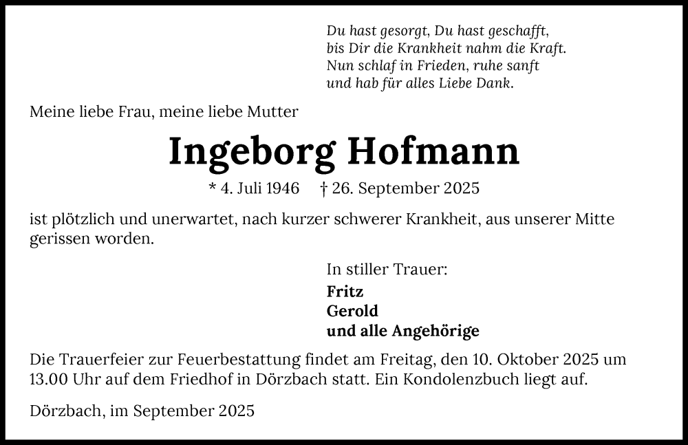 Hier finden Sie alle Traueranzeigen aus der Zeitung, die bisher für Ingeborg Hofmann erschienen sind. Weitere Traueranzeigen, die in der Zeitung erscheinen, werden hier ebenfalls aufgelistet