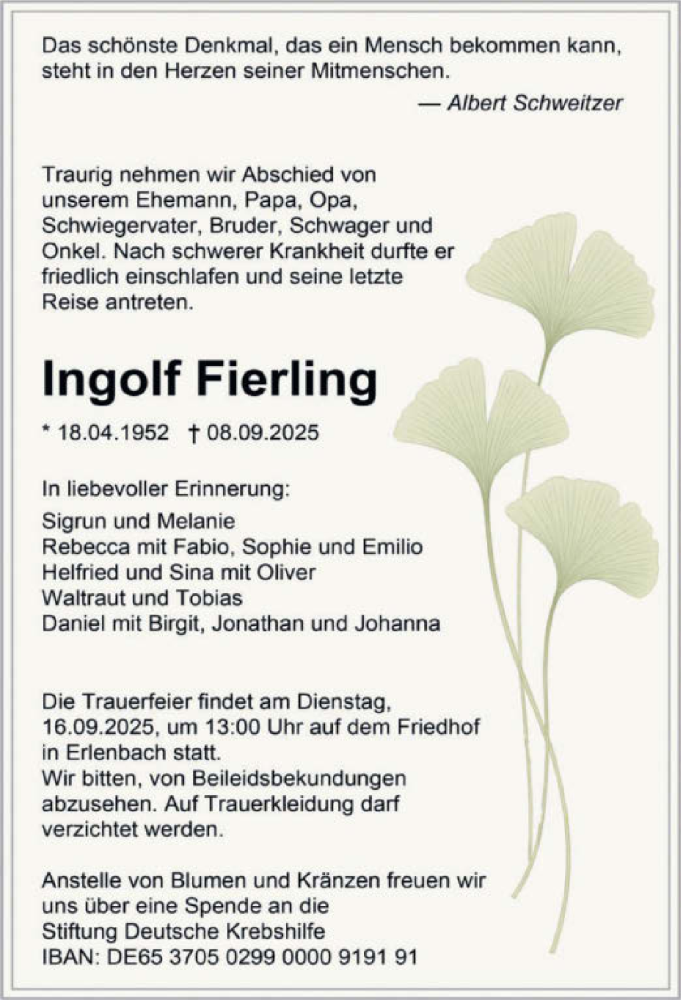 Hier finden Sie alle Traueranzeigen aus der Zeitung, die bisher für Ingolf Fierling erschienen sind. Weitere Traueranzeigen, die in der Zeitung erscheinen, werden hier ebenfalls aufgelistet