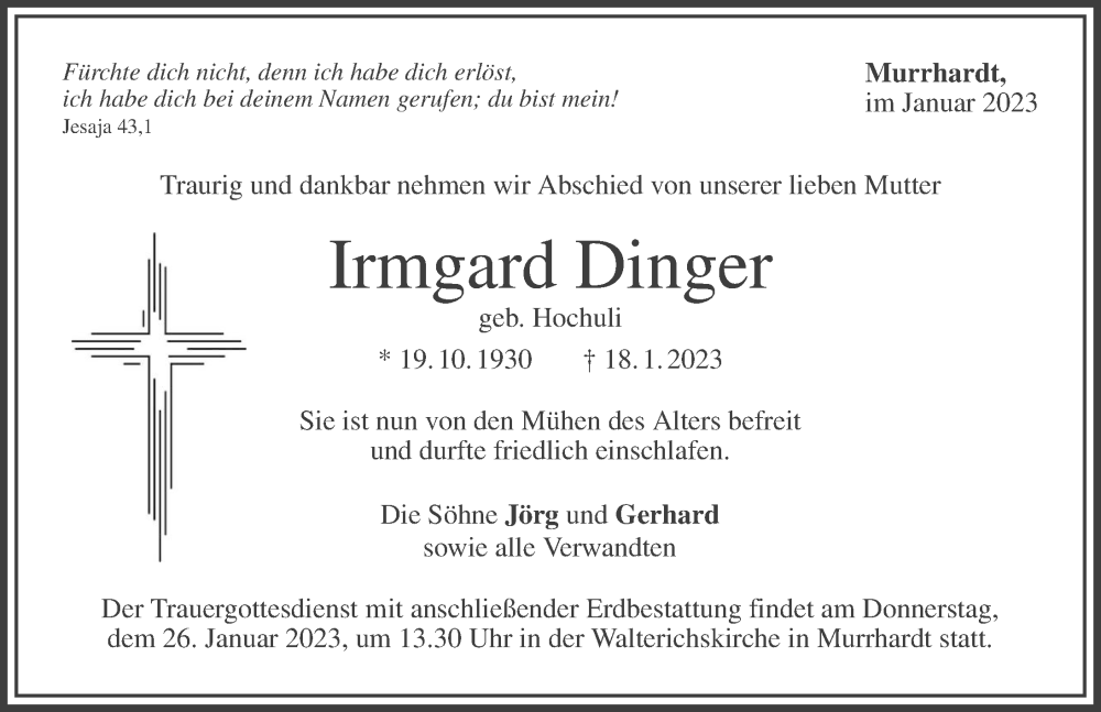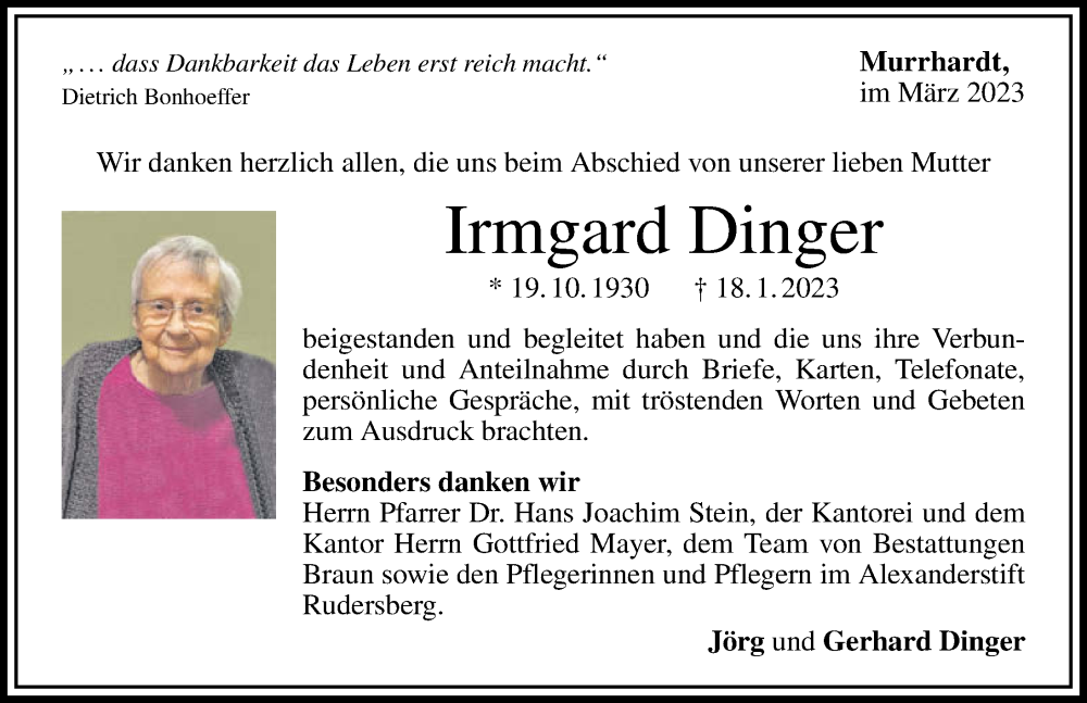 Hier finden Sie alle Traueranzeigen aus der Zeitung, die bisher für Irmgard Dinger erschienen sind. Weitere Traueranzeigen, die in der Zeitung erscheinen, werden hier ebenfalls aufgelistet