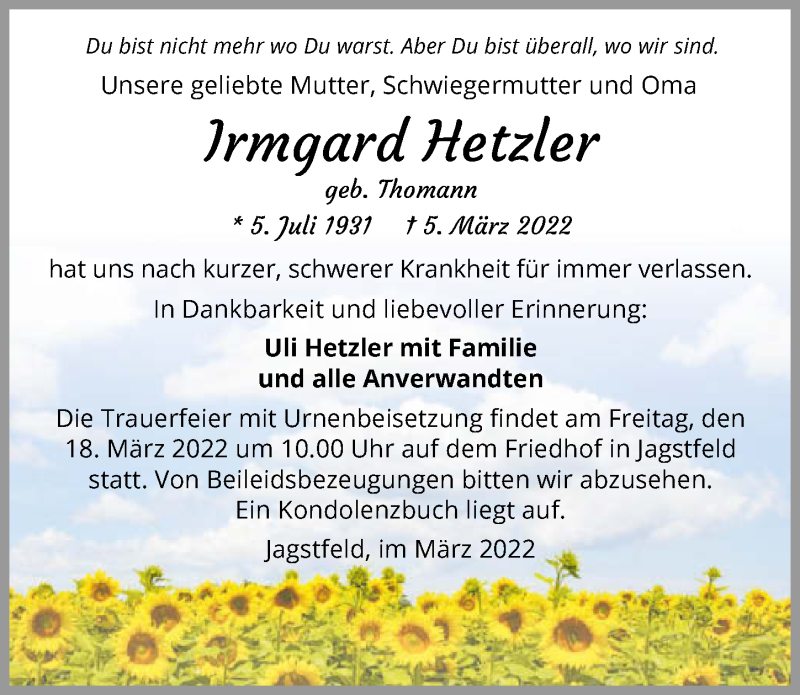 Hier finden Sie alle Traueranzeigen aus der Zeitung, die bisher für Irmgard Hetzler erschienen sind. Weitere Traueranzeigen, die in der Zeitung erscheinen, werden hier ebenfalls aufgelistet