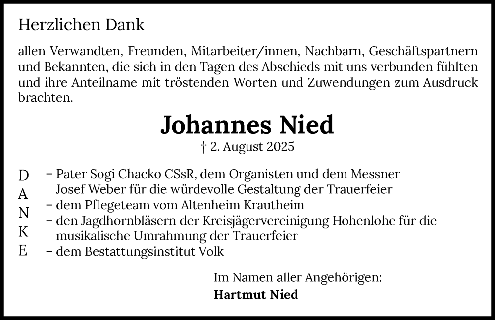 Hier finden Sie alle Traueranzeigen aus der Zeitung, die bisher für Johannes Nied erschienen sind. Weitere Traueranzeigen, die in der Zeitung erscheinen, werden hier ebenfalls aufgelistet
