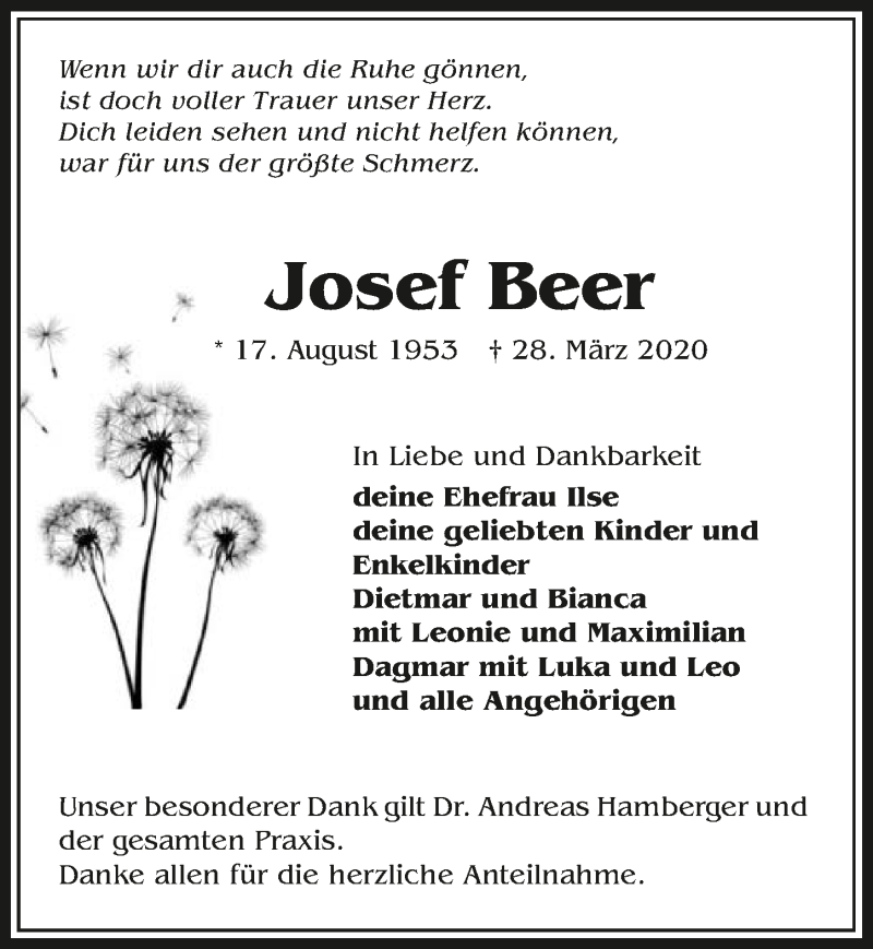 Hier finden Sie alle Traueranzeigen aus der Zeitung, die bisher für Josef Beer erschienen sind. Weitere Traueranzeigen, die in der Zeitung erscheinen, werden hier ebenfalls aufgelistet