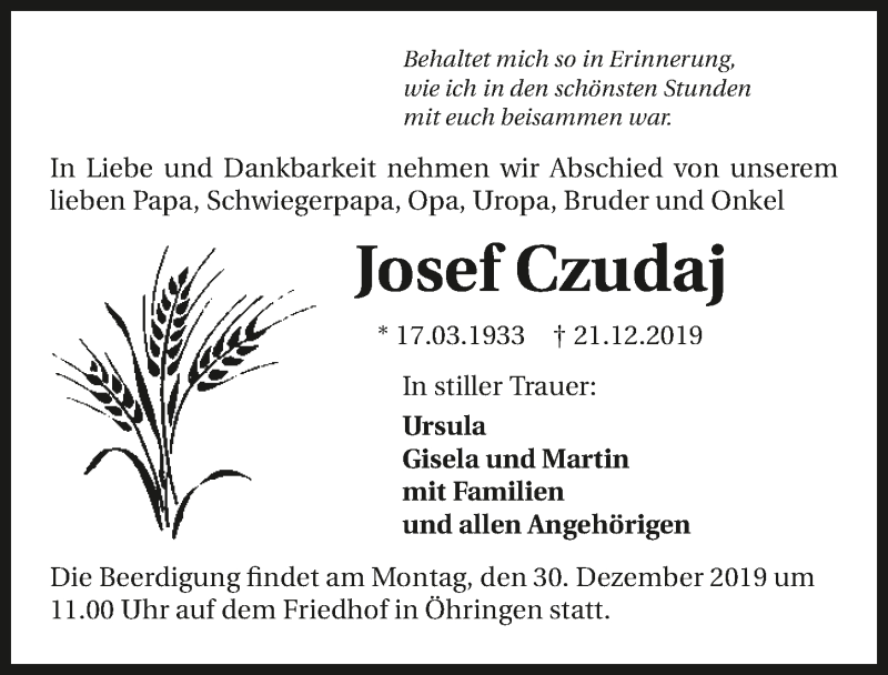 Hier finden Sie alle Traueranzeigen aus der Zeitung, die bisher für Josef Czudaj erschienen sind. Weitere Traueranzeigen, die in der Zeitung erscheinen, werden hier ebenfalls aufgelistet