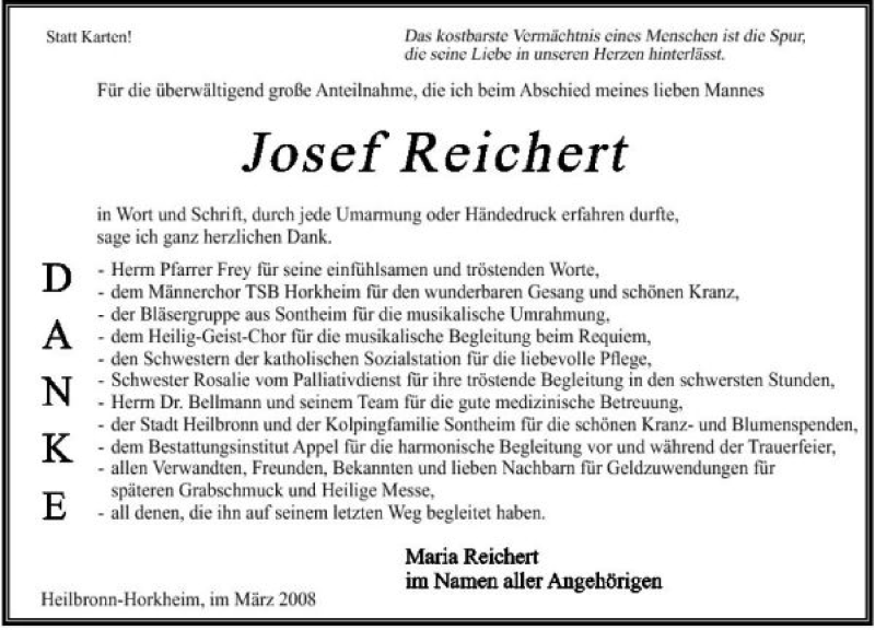 Hier finden Sie alle Traueranzeigen aus der Zeitung, die bisher für Josef Reichert erschienen sind. Weitere Traueranzeigen, die in der Zeitung erscheinen, werden hier ebenfalls aufgelistet