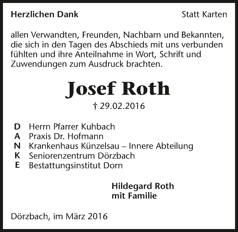 Hier finden Sie alle Traueranzeigen aus der Zeitung, die bisher für Josef Roth erschienen sind. Weitere Traueranzeigen, die in der Zeitung erscheinen, werden hier ebenfalls aufgelistet