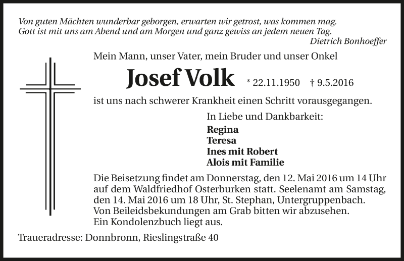 Hier finden Sie alle Traueranzeigen aus der Zeitung, die bisher für Josef Volk erschienen sind. Weitere Traueranzeigen, die in der Zeitung erscheinen, werden hier ebenfalls aufgelistet