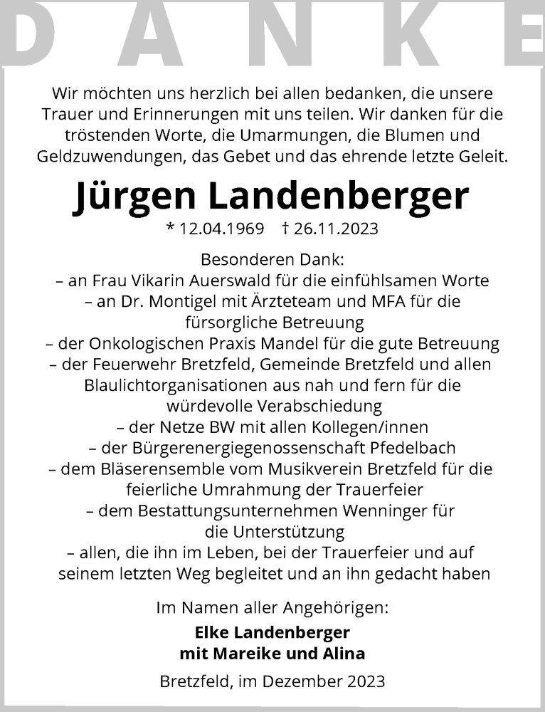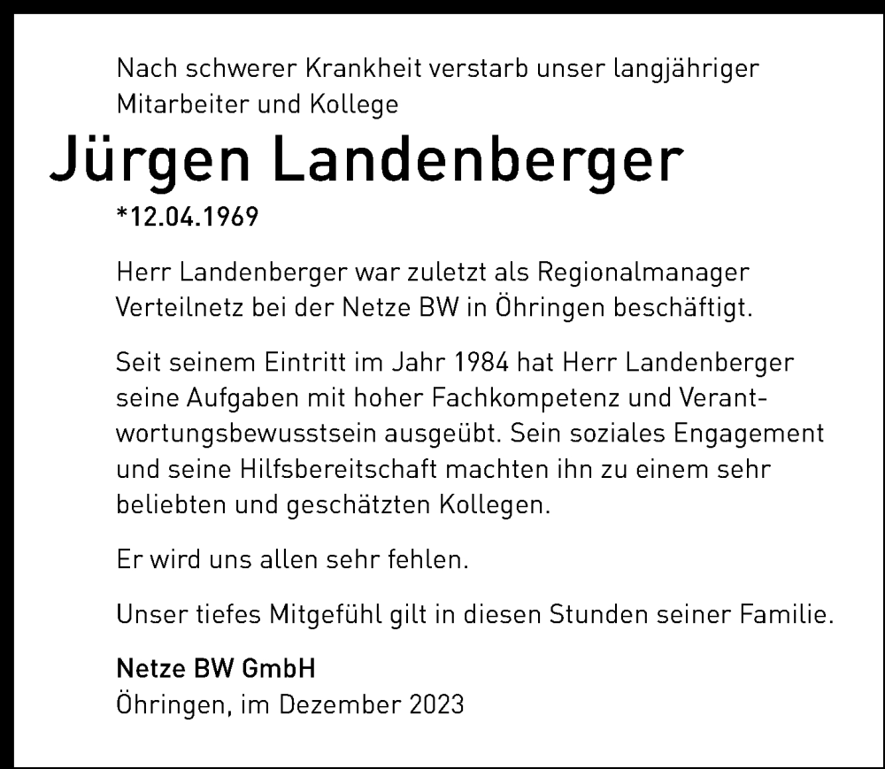 Hier finden Sie alle Traueranzeigen aus der Zeitung, die bisher für Jürgen Landenberger erschienen sind. Weitere Traueranzeigen, die in der Zeitung erscheinen, werden hier ebenfalls aufgelistet