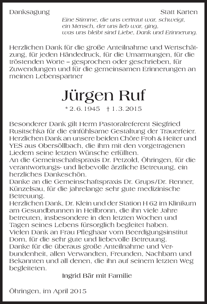 Hier finden Sie alle Traueranzeigen aus der Zeitung, die bisher für Jürgen Ruf erschienen sind. Weitere Traueranzeigen, die in der Zeitung erscheinen, werden hier ebenfalls aufgelistet