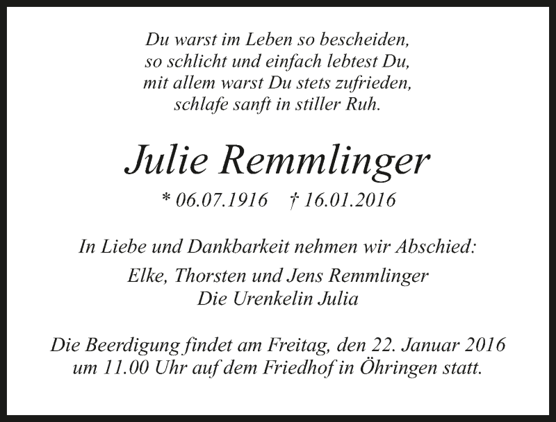 Hier finden Sie alle Traueranzeigen aus der Zeitung, die bisher für Julie Remmlinger erschienen sind. Weitere Traueranzeigen, die in der Zeitung erscheinen, werden hier ebenfalls aufgelistet